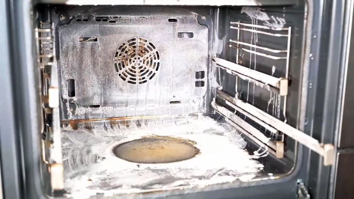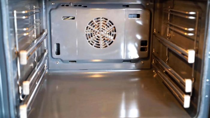 Перед очисткой из духовки вынимаются противни и решетки. Все отвалившиеся частицы нагара нужно смести щеткой и выбросить.