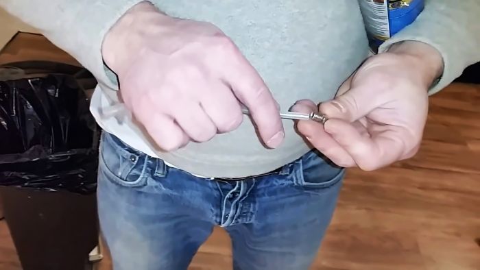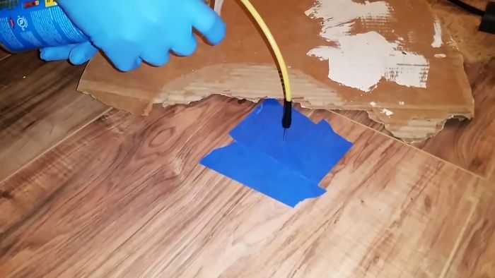 Вокруг отверстия приклеиваем малярную ленту или изоленту. Это нужно, чтобы в случае выхода монтажная пена не испачкать пол. Затем в отверстие вставлять иголка, и внутрь подается немного пены.