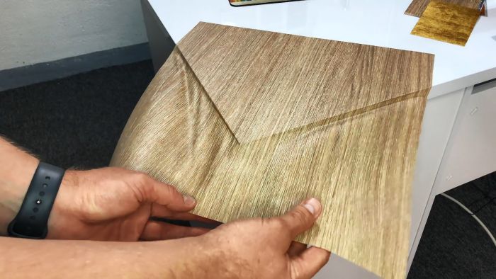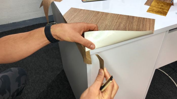 Пленка отрезается с запасом. Она должна выходить за пределы детали со всех сторон. На начальном этапе все делается как обычно. Часть закрывающего клейкую сторону слоя бумаги срывается, и поклейка выполняется на лицевую сторону детали. При этом должны остаться свесы.