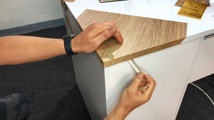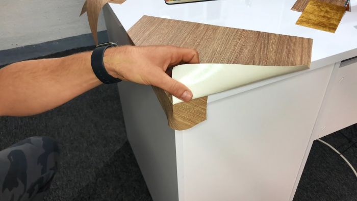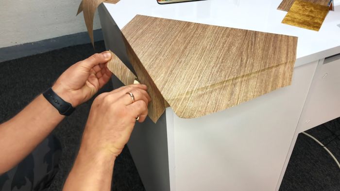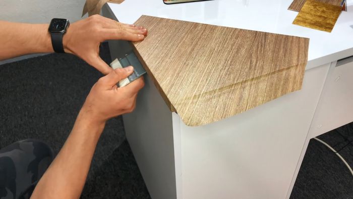 В завершении нужно проконтролировать везде ли приклеилась пленка на изгибах. Огрехи важно прижать. Оклеив так мебель, вы сделаете ее как будто новой, вообще не похожей на восстановленную.