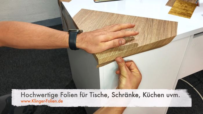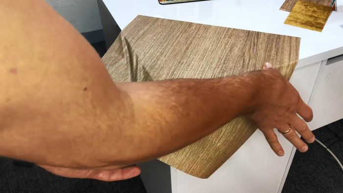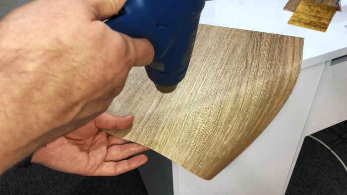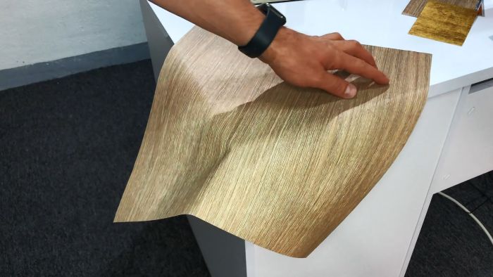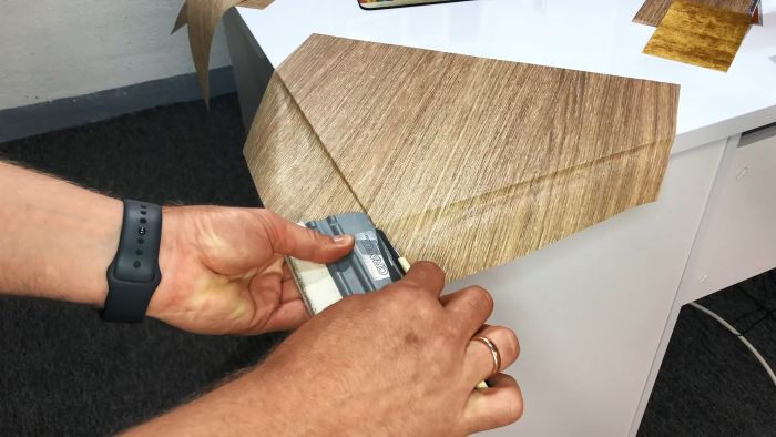 После этого пленку со стороны кромки, к которой был приложен шпатель, можно уже приклеивать. Она ляжет идеально