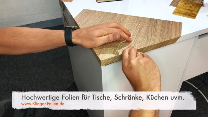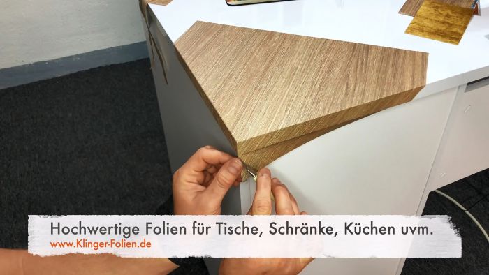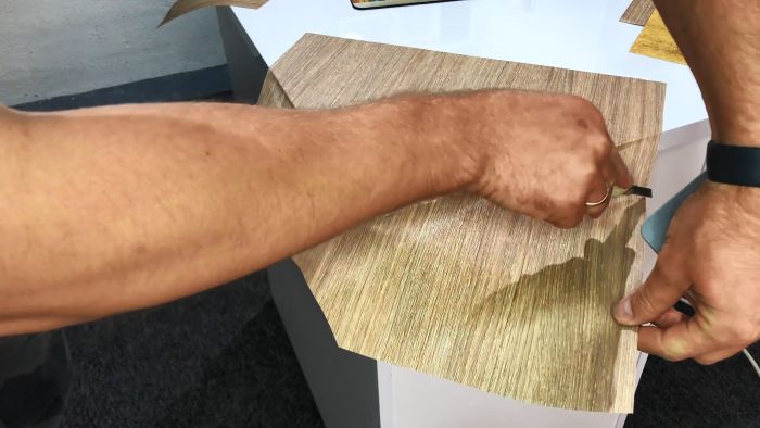 Пленка окончательно приклеивается на эту кромку. От нее нужно оставить свес на 10 мм больший, чем открытая часть детали на изнанке. Затем он приклеивается на изнаночную сторону. Теперь лезвие ножа прикладывается на обратную сторону детали от угла, чтобы срезать пленку по линии, где она не приклеена на стыке со следующей деталью. Такой способ отрезки с подгибом дает очень качественную внешне идеальную кромку.