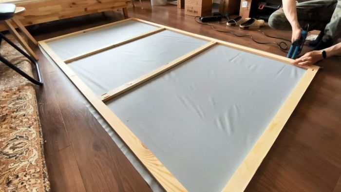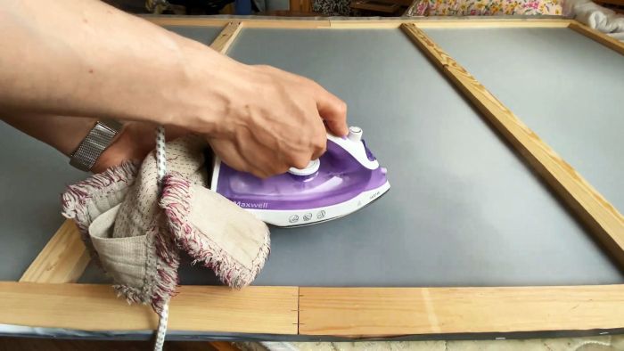 Ткань прибивается степлером на рамку. Она подворачивается, и скобы вбиваются на обратной стороне реек.