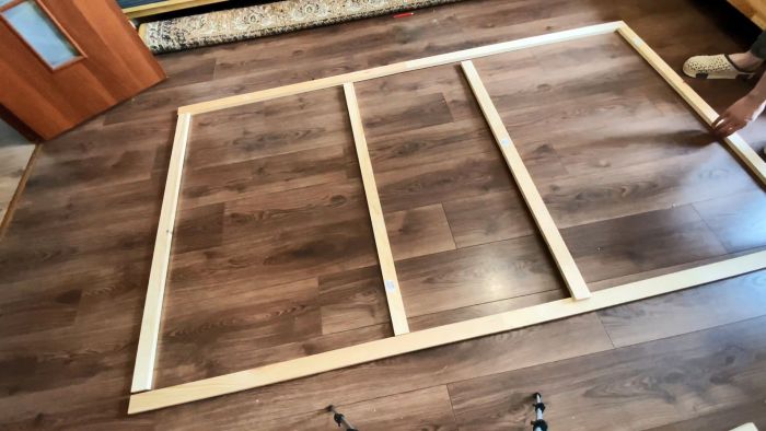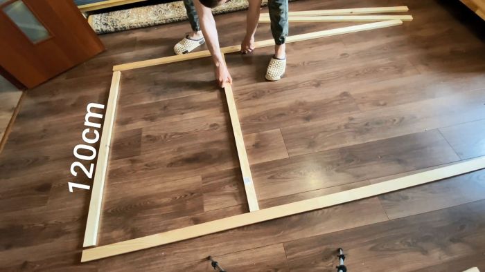 Отталкиваясь от сделанных меток, нужно изготовить рамку экрана из рейки. В данном случае делается 100 дюймов экран со сторонами 120х220 см. Для жесткости понадобится сделать на рамке несколько перемычек. Соединять рейки можно любым удобным способом. Дешевле всего это делать на клей и косой шуруп, если имеется такой кондуктор. Можно также использовать металлические монтажные уголки.