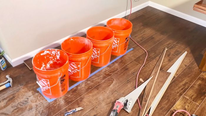 Чтобы клей затвердел, на новую доску ставим груз (гнет), в нашем случае, ведра с водой, и оставляем все на одну ночь.