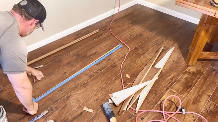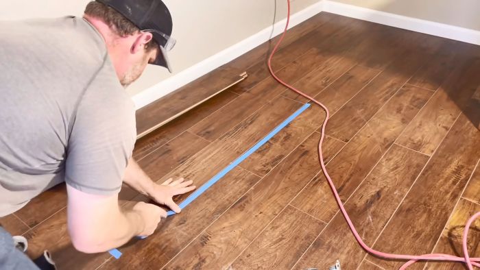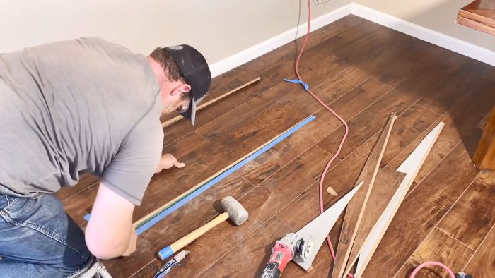 Примеряем к освободившемуся месту новую ламинатную доску, которая не ложится как положено из-за шипа короткого замка.