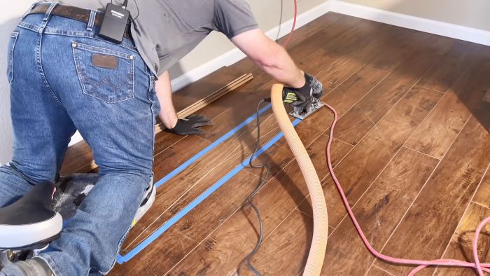 Устанавливаем вылет диска пилы на величину толщины доски и, подключив пылеотсос, разрезаем поврежденную доску ламината крест на крест по диагонали.