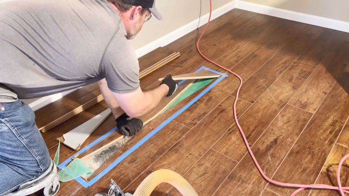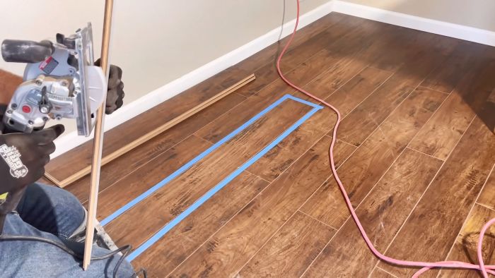 Выделяем поврежденную доску ламината по периметру строительным скотчем, одновременно защищая кромки соседних неповрежденных досок.