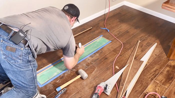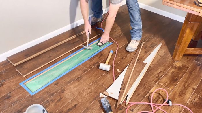Постараемся отодвинуть соседнюю доску с короткой стороны дефектной доски легкими ударами резиновой киянки наружу. Этот способ может не дать результата, особенно если досок до стены меньше трех.