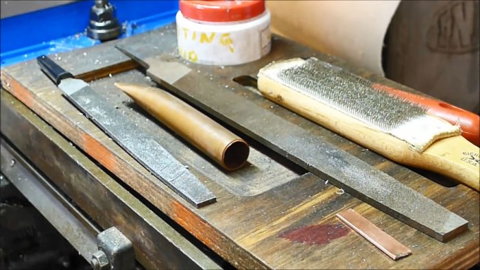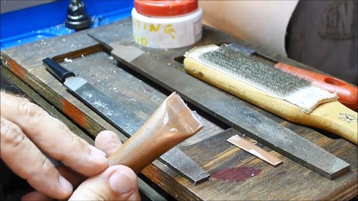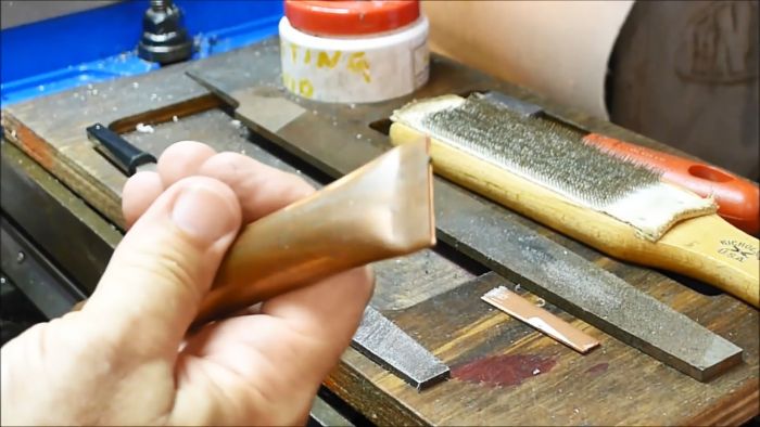 Для чистки напильников нужно изготовить специальный инструмент из медной трубки. Это может быть любая по толщине труба, но чем она больше в диаметр, тем быстрее почистит насечки. Край заготовки необходимо сплюснуть молотком или в тисках.