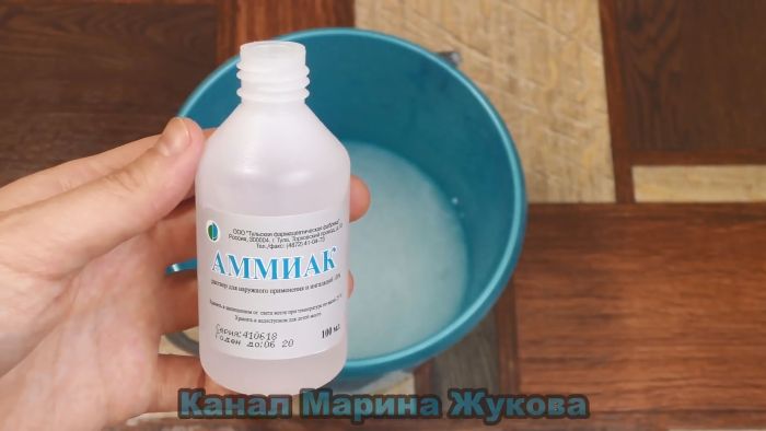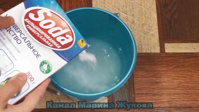 В емкость набирается 1 л горячей воды, затем добавляется 3 ст.л. кальцинированной соды и 1 ст.л. аммиака.