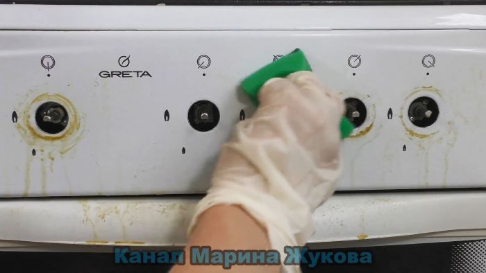 После раствора он будет сходить буквально за одно движение. После этого ручки и накладки ополаскиваются, и устанавливаются обратно. Применяя этот способ, можно вычистить плиту до идеала практически не прикладывая усилий, и не рискуя поцарапать эмаль на плите или пластик ручек.