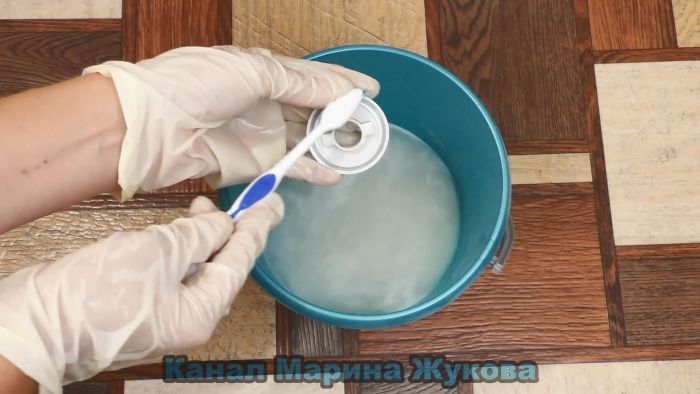 Вымоченные в чистящем растворе ручки нужно немного поскрести зубной щеткой, чтобы окончательно убрать размякший толстый слой жира.