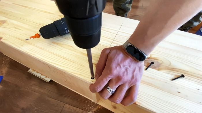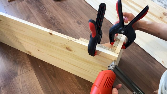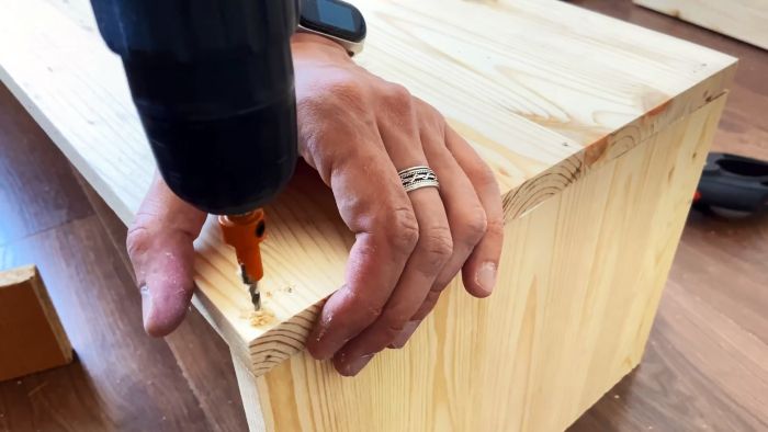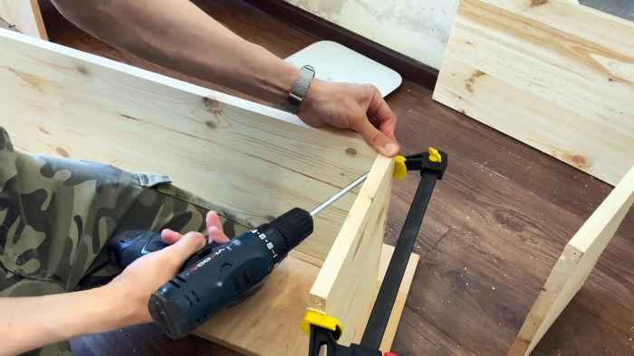 В одном деревянном бруске сверлим с помощью кондуктора боковые гнезда, наносим на контактную поверхность клей и прижимаем к верхней доске тумбы струбцинами так, чтобы боковой срез был внутри. В гнезда вставляем шурупы и окончательно закрепляем брус к тумбе.