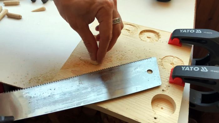 Сверлим в бросовом куске сосновой доски под углом отверстия на половину нагеля. Вбиваем их в наклонные отверстия до упора и ручной пилой отрезаем выступающую половину нагеля.