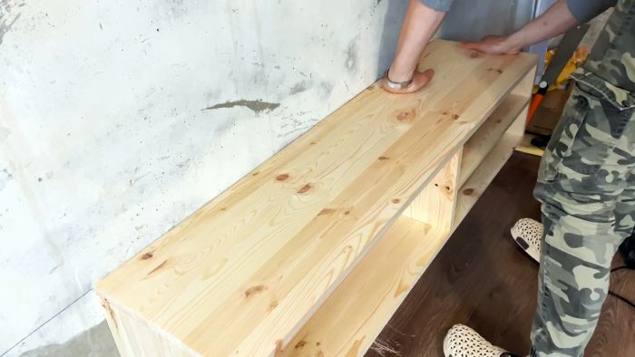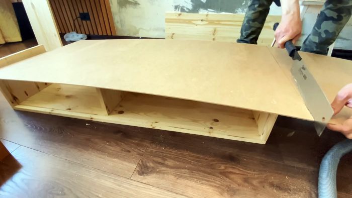 Вставляем в отсеки тумбы полки, отрезаем по месту и закрепляем шурупами к боковым стенкам тумбы.