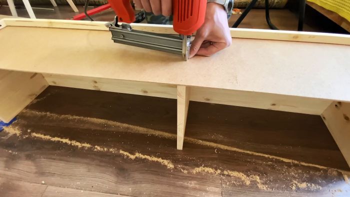 Отрезаем тонкую ДСП по размеру и устанавливаем ее в пазы корпусных деталей тумбы. Закрепляем ДСП к стенкам степлером.