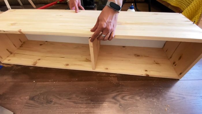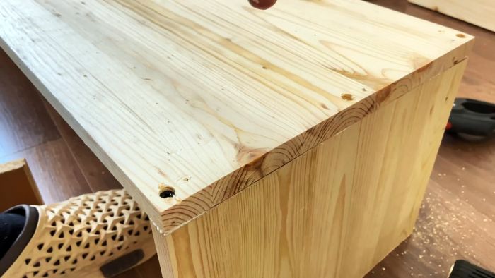 На верхние торцы поперечных стенок наносим клей и устанавливаем верх тумбы. Скрепляем с поперечными стенками шурупами.