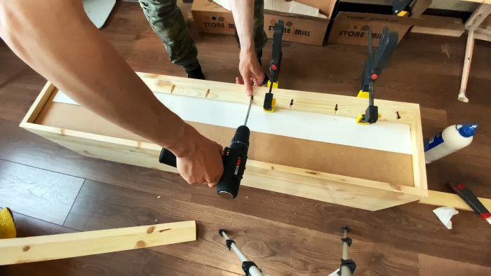Наносим клей на торец боковины и устанавливаем по месту на основание. Затем под углом сверлений скрепляем детали корпуса тумбы шурупами.