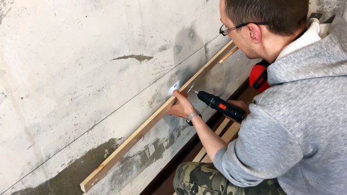 Отмечаем горизонталь на стенке, сверлим отверстия и закрепляем шурупами к ней брус со скошенной сверху стороной, направленной к стене.