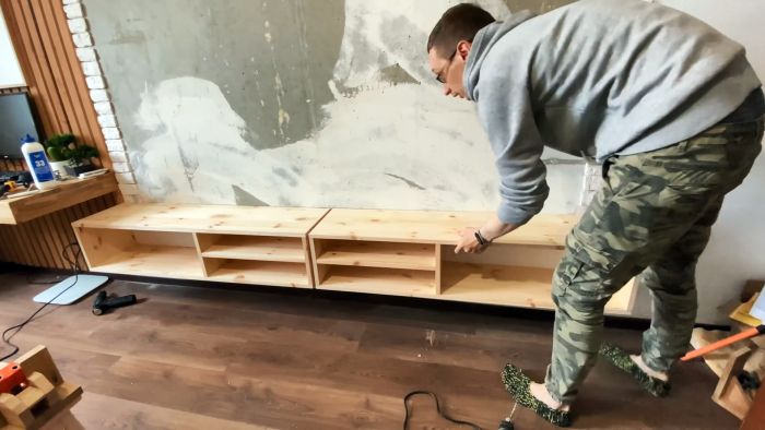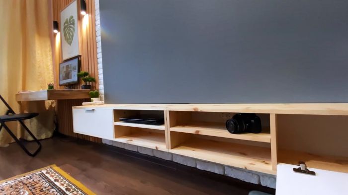 Интерьер комнаты с телевизором станет гармоничней с подвесной тумбой, придавая пространству воздушность и визуально расширяя его. Тумба крепится прямо к стене, поэтому ей не нужны ножки-опоры. Она не только украсит пространство, но и повысит эффективность его использования, а также упростит уборку, т. к. под ней не будет скапливаться пыль. Для ее изготовления нужны обычные материалы и знание азов столярного дела.