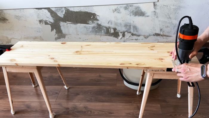 На сосновых досках по одному краю в продольном направлении выполняем фрезером паз.