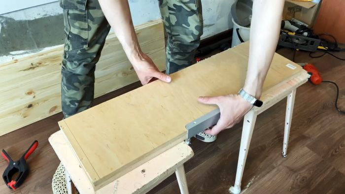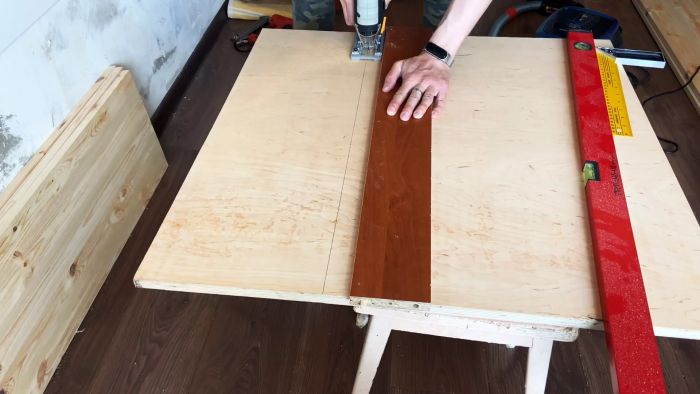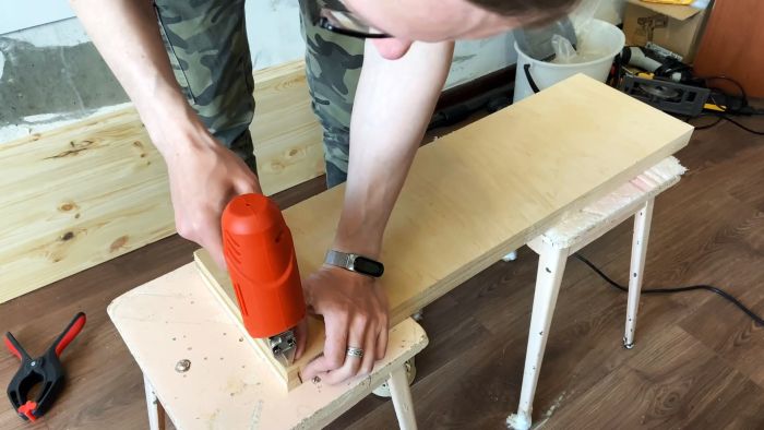 От многослойной фанеры отрезаем заготовки дверец лобзиковой пилой по установленной направляющей.