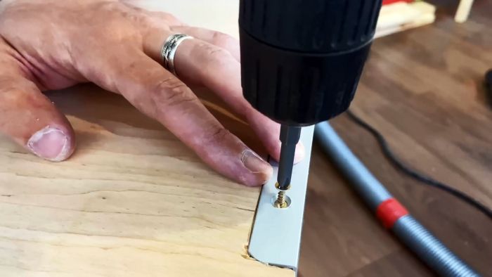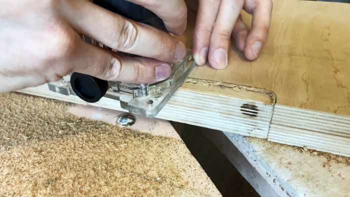 Выставляем вылет фрезы на фрезере по толщине ручки и выполняем углубления на заготовках дверец. Подправляем их лезвием строительного ножа. Закрепляем ручки к дверцам шурупами.