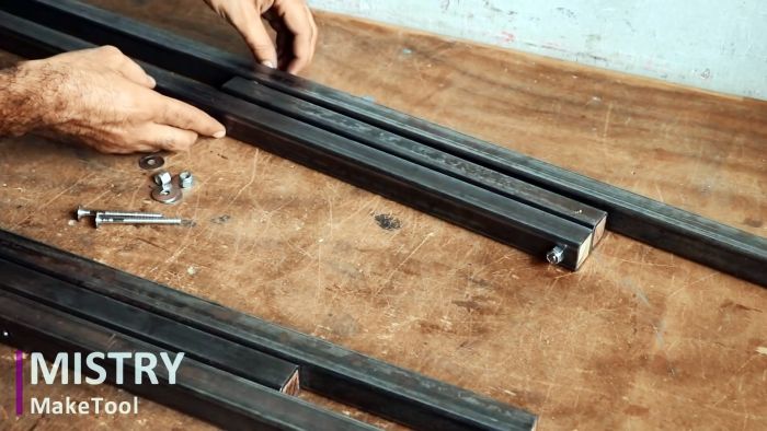 Скрепляем заготовки из квадратных труб болтами со скругленными головками, шайбами и гайками. К длинным заготовкам по центру прикручиваем короткие, а к ним – средние по длине.