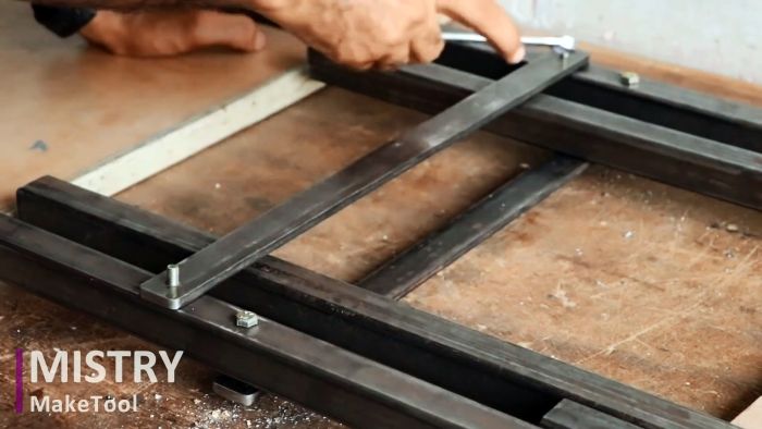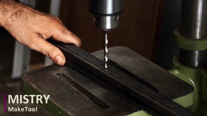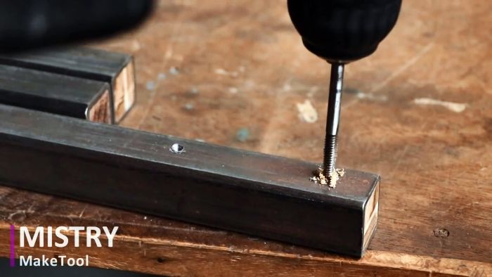 Прикладываем поперечно две стальные одинаковые полосы к передним ножкам с лицевой и тыльной стороны в обхват задних ножек. Делаем разметку, сверлим отверстия и выполняем резьбу в отверстиях полос.