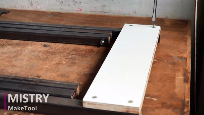 Примеряем сидение из многослойной ламинированной фанеры к горизонтальным элементам из квадратной трубы.