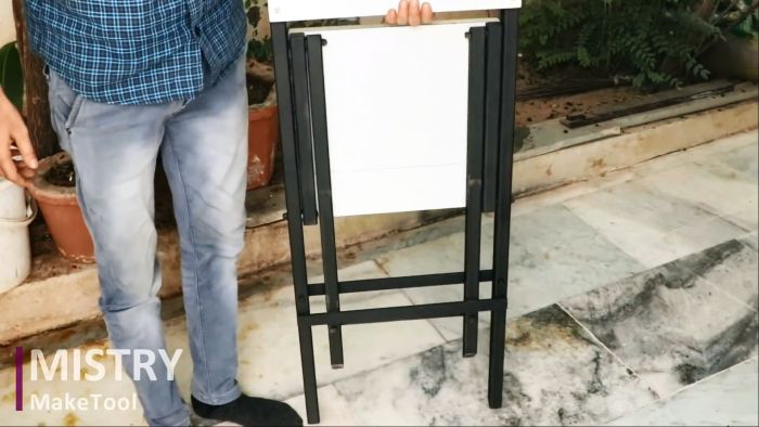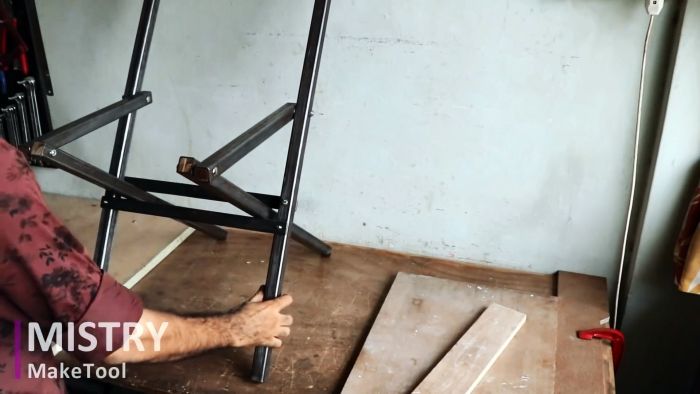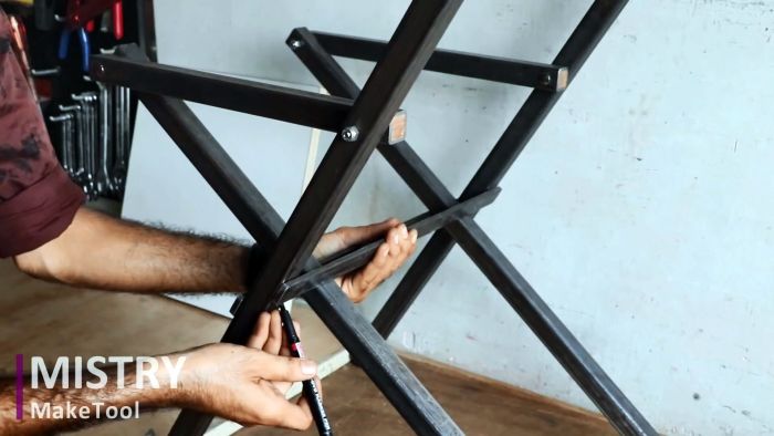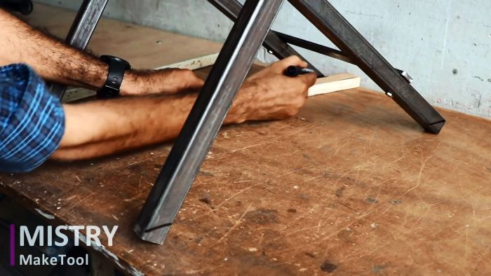 По отверстиям в полосах сверлим соответствующие отверстия в передних ножках с двух сторон и стягиваем их поперечными полосами с помощью болтов. Эти полосы не позволят передним ножкам расходиться в стороны под нагрузкой и служат направляющими для задних ножек.