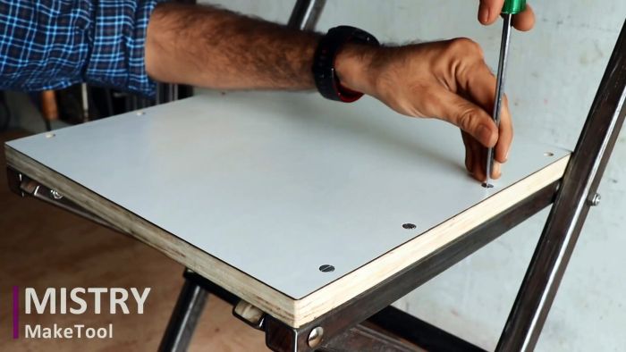 Уложив сидение на место, сверлим отверстия в нем и силовых элементах. Скрепляем эти детали винтами с плоскими потайными головками.