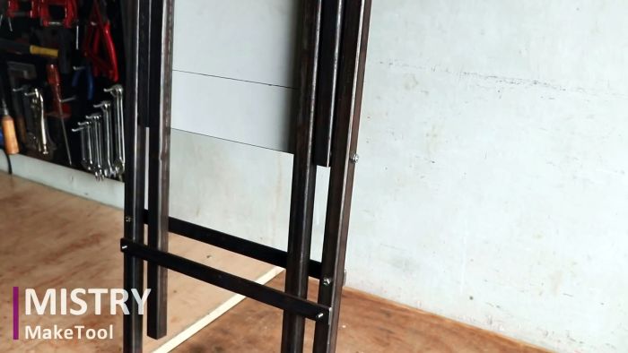 Придаем жесткость задним ножкам, скрепляя их между собой стальной пластиной ближе к нижним концам по сквозным отверстиям в ножках и отверстиям в полосе с резьбой болтами.
