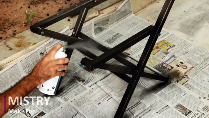 Сняв спинку и сидение, окрашиваем металлические элементы раскладного стула аэрозольной краской и после ее высыхания возвращаем на место спинку и сидение.