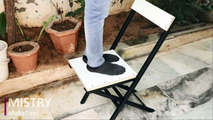 Устанавливаем нижние концы ножек стула на ровную поверхность и выполняем жесткий упор так, чтобы короткие заготовки из квадратной трубы заняли горизонтальное положение.