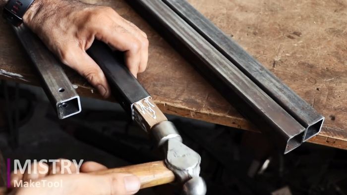 Нарезаем из деревянного бруса-квадрата внутренние заглушки, наносим на них клей и вбиваем молотком в торцы заготовок из профильной трубы.