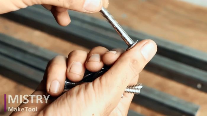 По отверстиям в спинке намечаем и сверлим отверстия в квадратных заготовках и нарезаем метчиком резьбу. Закрепляем спинку к заготовкам винтами с потайной головкой.