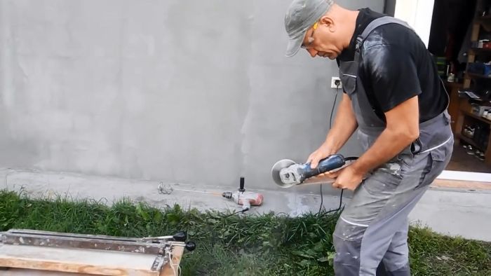 Затем на короткой стороне разметки выполняется рез болгаркой с алмазным диском.
