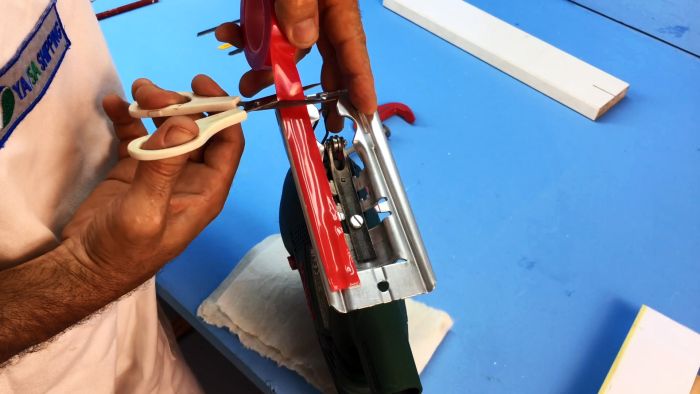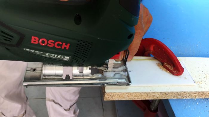 Берем кусок пластика и вырезаем из него прямоугольник по размерам подошвы лобзика.