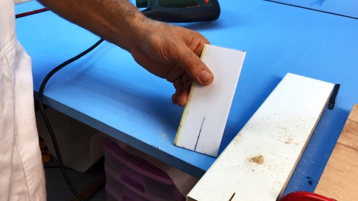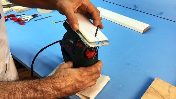 При помощи того же лобзика делаем пропил в прямоугольнике примерно на две третьи.