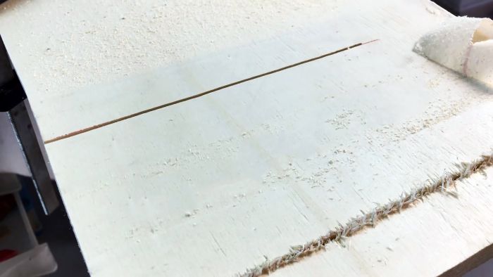 При пилении хорошо прижимаем лобзик к поверхности и сколы не образуются, так как приклеенный пластик создает давление на кромку и частички древесины не разлетаются.