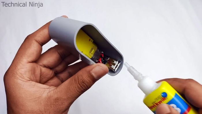 Нужно, чтобы его USB порт был направлен на открытый торец корпуса. Во второй заглушке нужно прорезать окно под USB порт. Затем она также вклеивается.