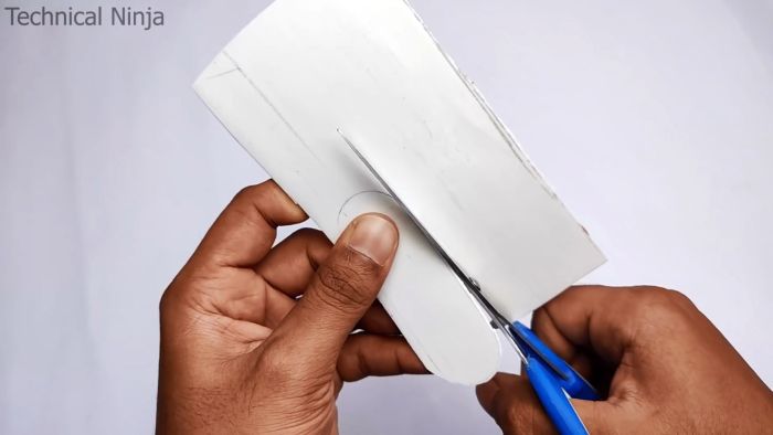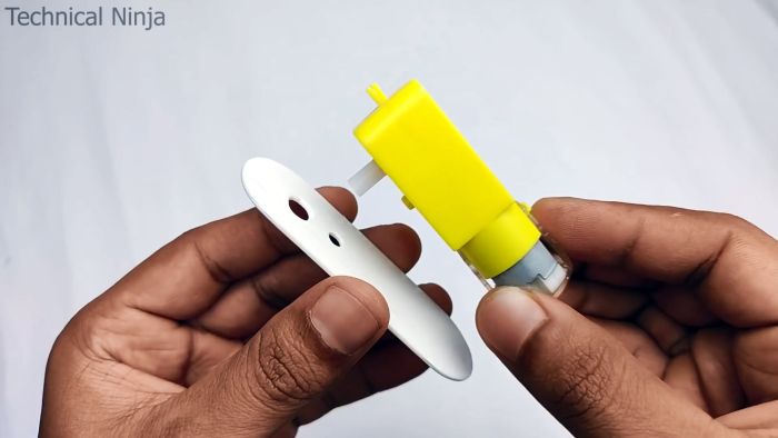 Из листового пластика вырезается 2 полоски для изготовления рычага вращения редуктора. Они склеиваются между собой, затем их углы скругляются. По краям рычага делаются отверстия. Одно под форму вала редуктора, а второе под саморез.