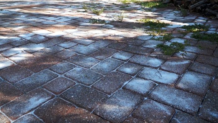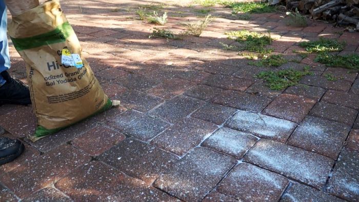 Первым делом нужно очень хорошо вымести дорожки, постаравшись убрать всю грязь и пыль с поверхности плиток, а также швов между ними. После этого рассыпается обычная поваренная соль.