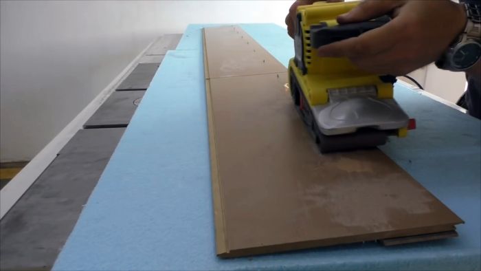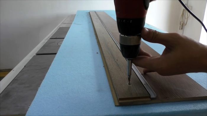 Укрепляем узкую планку винтами по длине, вкручивая их в основание из ламината. Также с обратной стороны стачиваем кончики винтов ручным гриндером.