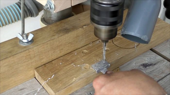 В спинке алюминиевого швеллера на равном расстоянии сверлим однотипные отверстия, рассверливая их с внутренней стороны под головки винтов, и удаляя заусенцы с внешней стороны наждачкой.