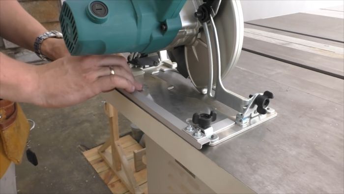 Заводим конец швеллера на циркулярке в паз направляющей шины и отрезаем от основания полоску, чтобы его ширина сравнялась с шириной рабочего основания пилы. Корректируем и другие стороны нашего приспособления.