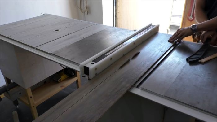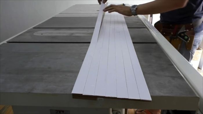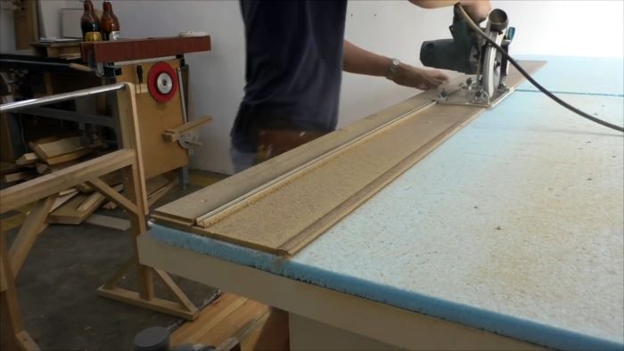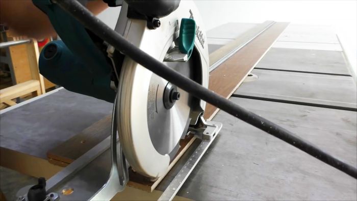 На стационарной циркулярке выполняем продольный и поперечный разрез ламината для получения заготовок основания направляющей шины.