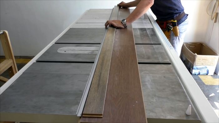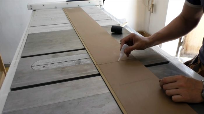 Соединяем две доски ламината по длине, простукивая шов киянкой, а с обратной стороны заполняем быстросохнущим клеем.